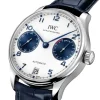 The clean white dial is clearly organised by blue-toned appliques and is characterised by a date display and power reserve indicator.