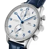 - Featuring a 41mm stainless steel case secured with a blue alligator leather strap