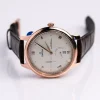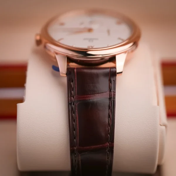 The pure look of the timepiece is completed by a date window at 6 o’clock, a small-seconds subdial at 9 o’clock, and a railway minute track on the outer zone.
