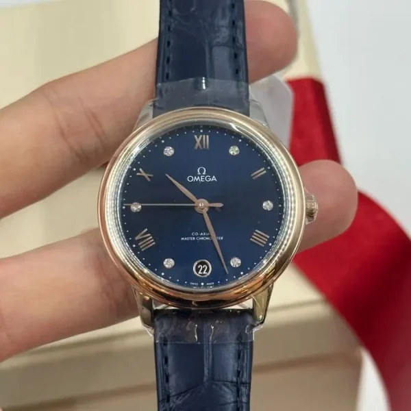 SpecificationsMakeOmegaModelDe VilleReference434.23.34.20.53.001Diameter34 mmCase MaterialSteel Sedna™ GoldDial ColorBlueBezel TypeFixedBezel ColorSedna™ GoldBezel MaterialSedna™ GoldCrystalDomed, scratch resistant sapphire crystal with anti reflective treatment insideMovementSelf-WindingBracelet TypeStrapBracelet MaterialLeatherClaspTang BuckleFunctionsAnti?magnetic, Chronometer, Date, Master Chronometer Certified, Transparent case back, DiamondsWater Resistance30 mWarrantyBalance of Original 2-year Omega International Limited Warranty