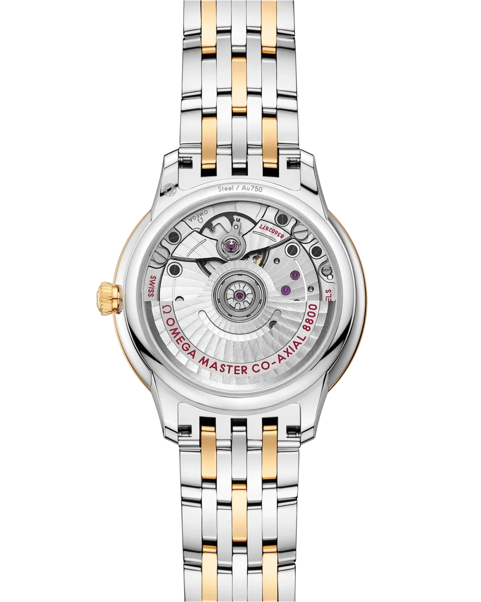 Introducing a stunning unworn De Ville Prestige Ref# 434.25.34.20.55.002 that remains the epitome of elegance and classic style in the OMEGA watch world. This exquisite 34 mm model, crafted from Stainless Steel and luxurious 18k Yellow Gold, exudes grace from every angle. A diamond-paved bezel adds a radiant frame to the dial, which is made from delicate white mother-of-pearl naturally unique in its shimmering beauty. The dial features elegant 18k Yellow Gold hands, perfectly complemented by alternating Roman numerals and sparkling diamond hour markers, each securely mounted in polished 18k Yellow Gold holders. The watch’s refined and understated design is subtly enhanced by practical details that elevate its elegance. A discreet date window positioned at 6 o’clock offers balanced symmetry, while the dotted minute scale along the outer zone adds a touch of precision and vintage charm. These thoughtful elements blend seamlessly into the timepiece’s composed aesthetic, delivering both form and function in perfect harmony. Domed scratch?resistant sapphire crystal with anti?reflective treatment inside ensures exceptional durability, preserving the pristine appearance of the dial. At the core of this exceptional timepiece lies the OMEGA Co-Axial Master Chronometer Calibre 8800—an engine of remarkable precision and resilience. Beating at 25,200 vibrations per hour and supported by 35 jewels, it delivers a robust 55-hour power reserve. This meticulously crafted movement is visible through the sapphire crystal caseback, allowing a glimpse into its mechanical artistry. The watch is paired with a refined bracelet combining Stainless Steel and 18k Yellow Gold, secured by a sleek Butterfly clasp that ensures both style and comfort. With a water resistance of 3 bar (30 metres / 100 feet), it is a sophisticated companion for everyday elegance.