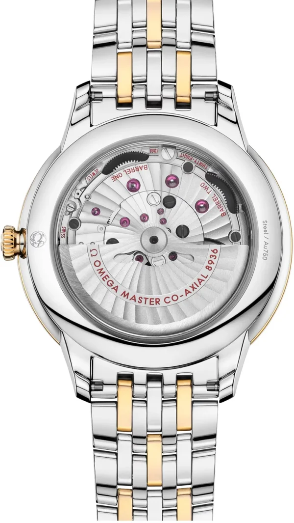 Introducing a stunning unworn De Ville Prestige Ref# 434.20.42.22.02.001 that remains the epitome of elegance and classic style in the OMEGA watch world. This exquisite 42mm model is crafted from stainless steel and luxurious 18k Sedna™ Gold, adding a warm, refined shine to the look. The opaline silver dial is domed and features a refined railway-style minute track around the outer circle. The hour markers elegantly alternate between classic Roman numerals and cabochons, adding a special charm to the dial. The central date ring with a satin-finish is particularly noteworthy. The delicate crescent-shaped hand with a PVD coating in Sedna™ gold stands out, indicating the current date on dark grey Arabic numerals. Domed scratch?resistant sapphire crystal with anti?reflective treatment inside ensures exceptional durability, preserving the pristine appearance of the dial. At the heart of this masterpiece is the Omega Co-Axial Master Chronometer caliber 8936, beating at 25,200 vibrations per hour, with 39 jewels and a 60-hour power reserve, which can be admired through the sapphire crystal on the caseback. The model is presented on a stylish bracelet made of Stainless Steel and 18k Sedna™ Gold, reliable and comfortable thanks to the Butterfly Clasp. Water resistance up to a 3 bar (30 metres / 100 feet).