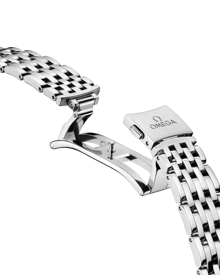 MakeOmegaModelDe Ville PrestigeReference434.15.34.20.52.001Diameter34 mmCase MaterialStainless Steel and DiamondsDial ColorSilverBezel TypeFixedBezel ColorSilverBezel MaterialDiamond-paved and Stainless SteelCrystalDomed, scratch?resistant sapphire crystal with anti?reflective treatment insideMovementSelf?windingBracelet TypeIntegrated braceletBracelet MaterialStainless SteelClaspStainless Steel Butterfly claspFunctionsDate, Seconds, Minutes, HoursWater ResistanceUp to a 3 bar (30 metres / 100 feet)WarrantyOmega International 5-year Warranty