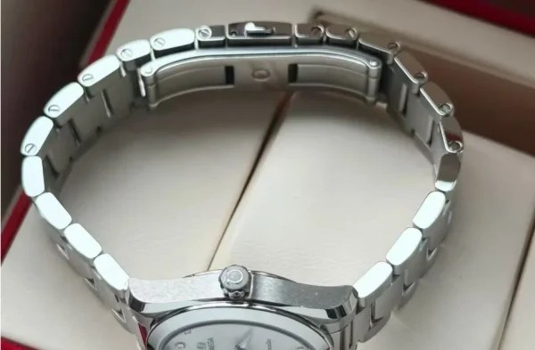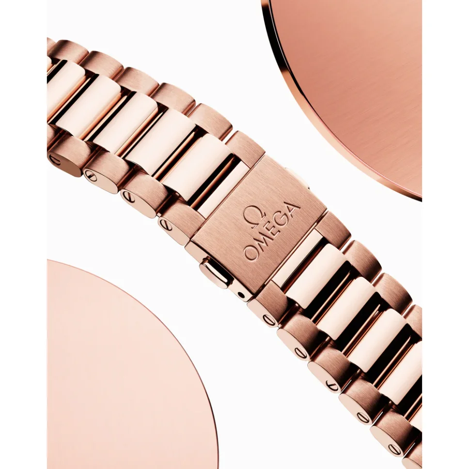 Calibre OMEGA 4061: Quartz movement with “Long Life” feature to maximize the autonomy of the battery. Exclusive red OMEGA logo with rhodium plated parts and circular graining.