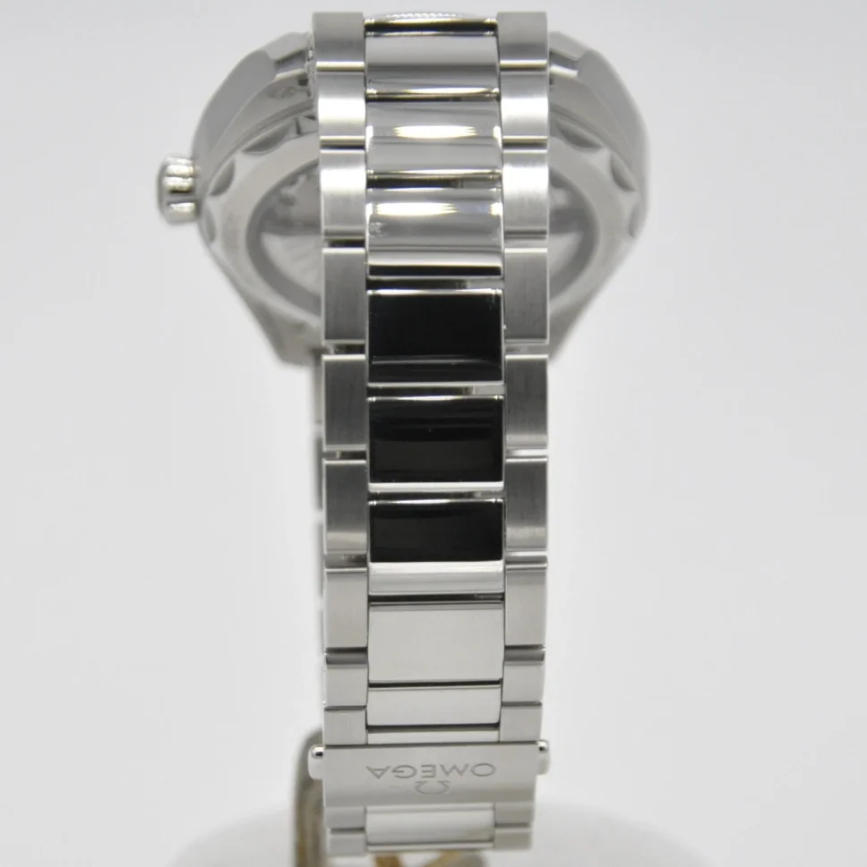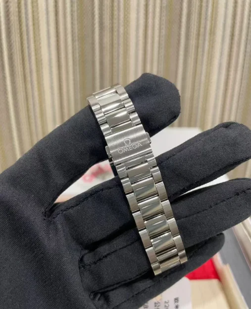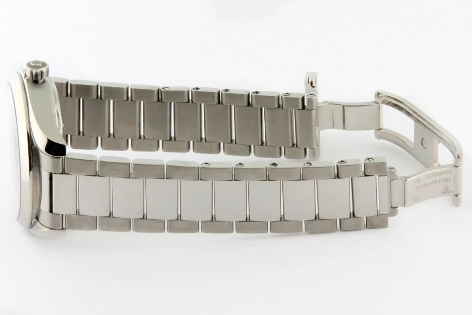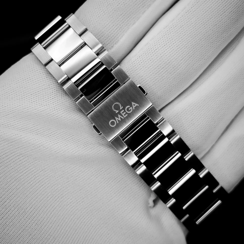 Calibre OMEGA 4061: Quartz movement with “Long Life” feature to maximize the autonomy of the battery. Exclusive red OMEGA logo with rhodium plated parts and circular graining.