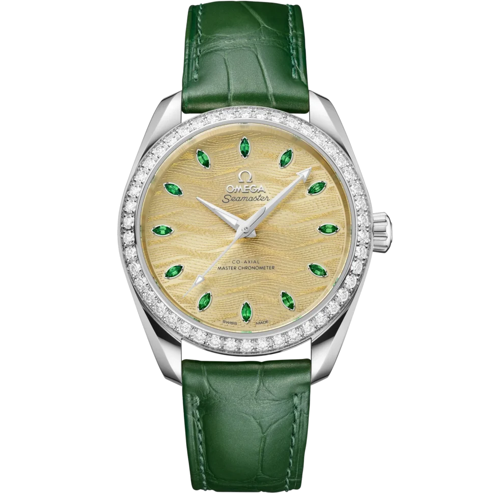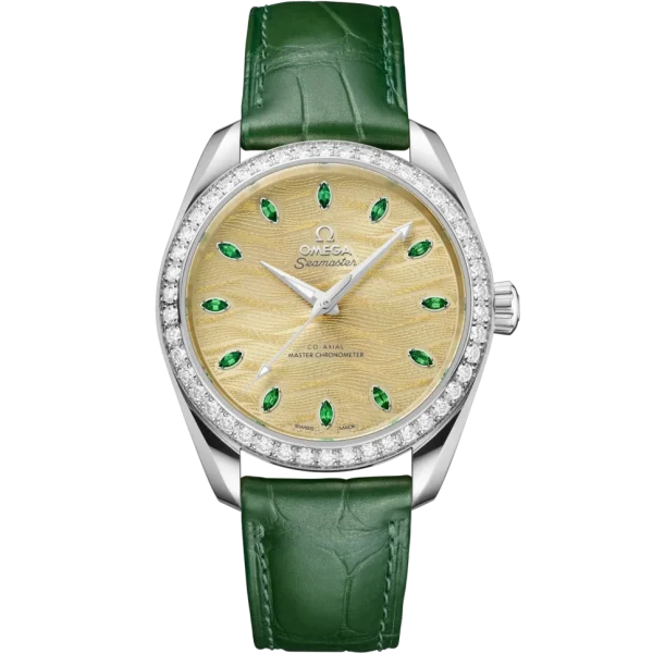 Presented on a shimmering green leather bracelet, this timepiece is powered by the OMEGA Co-Axial Master Chronometer calibre 8807, certified at the industry’s highest standard by the Swiss Federal Institute of Metrology (METAS).