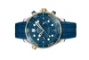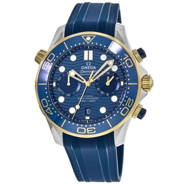 Since 1993, the Seamaster Professional Diver 300M has enjoyed a legendary following. Today’s modern collection has embraced that famous ocean heritage and updated it with OMEGA’s best innovation and design.This 44 mm chronograph model is crafted from stainless steel and 18K yellow gold, and includes a polished blue ceramic bezel with a Ceragold™ diving scale. The pushers are also polished blue ceramic, as well as the dial which features laser-engraved waves and a date window at 6 o’clock.The subdial hands are 18K yellow gold, along with all other hands and indexes which are filled with white Super-LumiNova.The watch is presented on a blue rubber strap and is driven by the OMEGA Master Chronometer Calibre 9900, which can be seen through the sapphire-crystal on the wave-edged caseback.