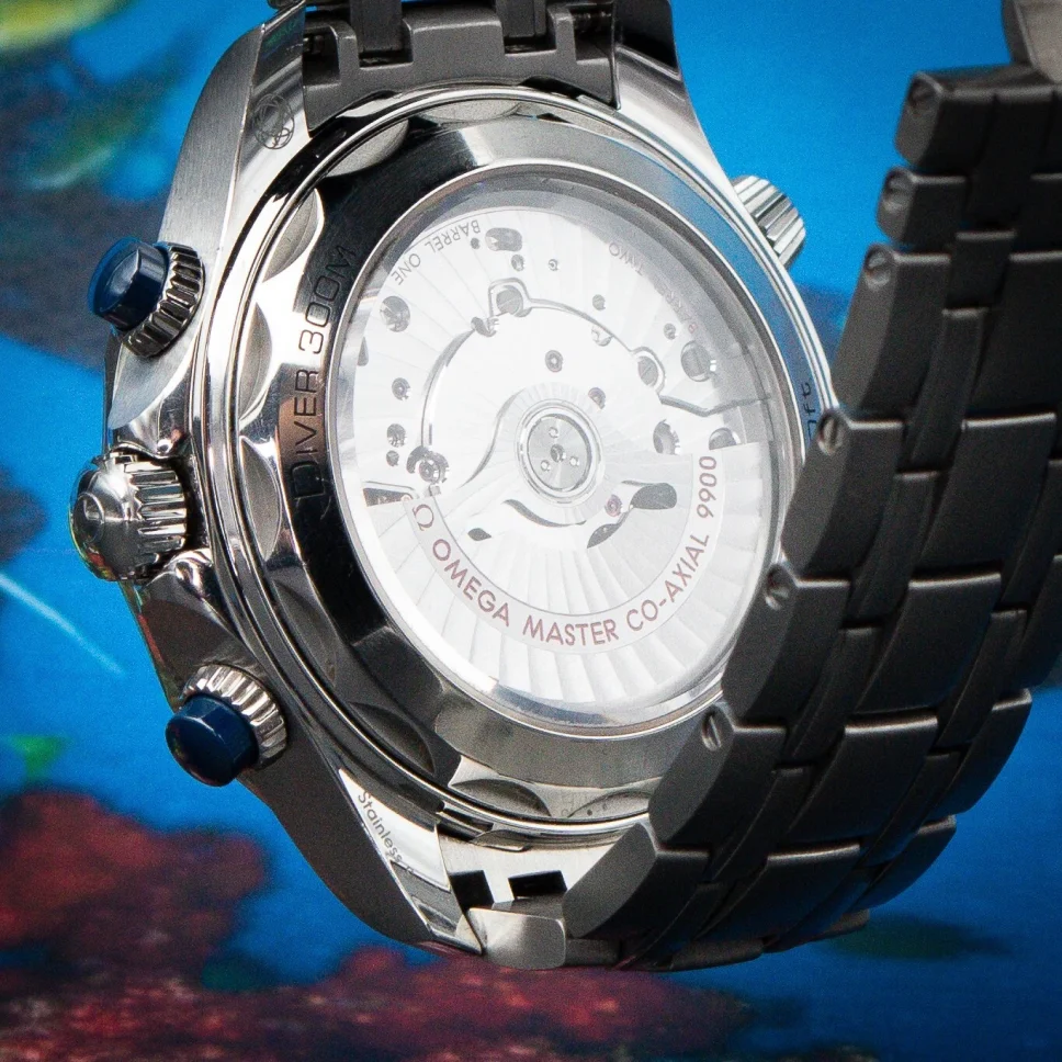 Since 1993, the Seamaster Professional Diver 300M has enjoyed a legendary following. Today’s modern collection has embraced that famous ocean heritage and updated it with OMEGA’s best innovation and design.This 44 mm chronograph model is crafted from stainless steel and includes a polished blue ceramic bezel with a white enamel diving scale. The pushers are also polished blue ceramic, while the dial is sun-brushed PVD chrome colour ceramic and features laser-engraved waves and a date window at 6 o’clock.The subdial hands are blued, along with all other hands and indexes which are filled with white Super-LumiNova.The watch is presented on a stainless steel bracelet and is driven by the OMEGA Master Chronometer Calibre 9900, which can be seen through the sapphire-crystal on the wave-edged caseback.