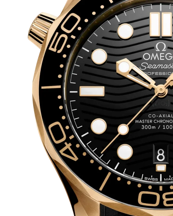 This 42 mm model is crafted in 18K Moonshine™ Gold and includes a black ceramic bezel with a Ceragold™ diving scale. The dial is also polished black ceramic and features laser-engraved waves and a date window at 6 o’clock.