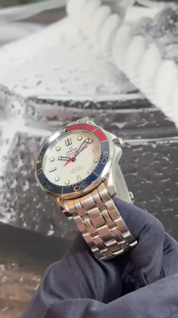 Dial: | White ceramic dial with luminescent skeleton hands and dot hour markers. Date calendar at the 3 o’clock aperture. Special edition 007 red seconds hand. |