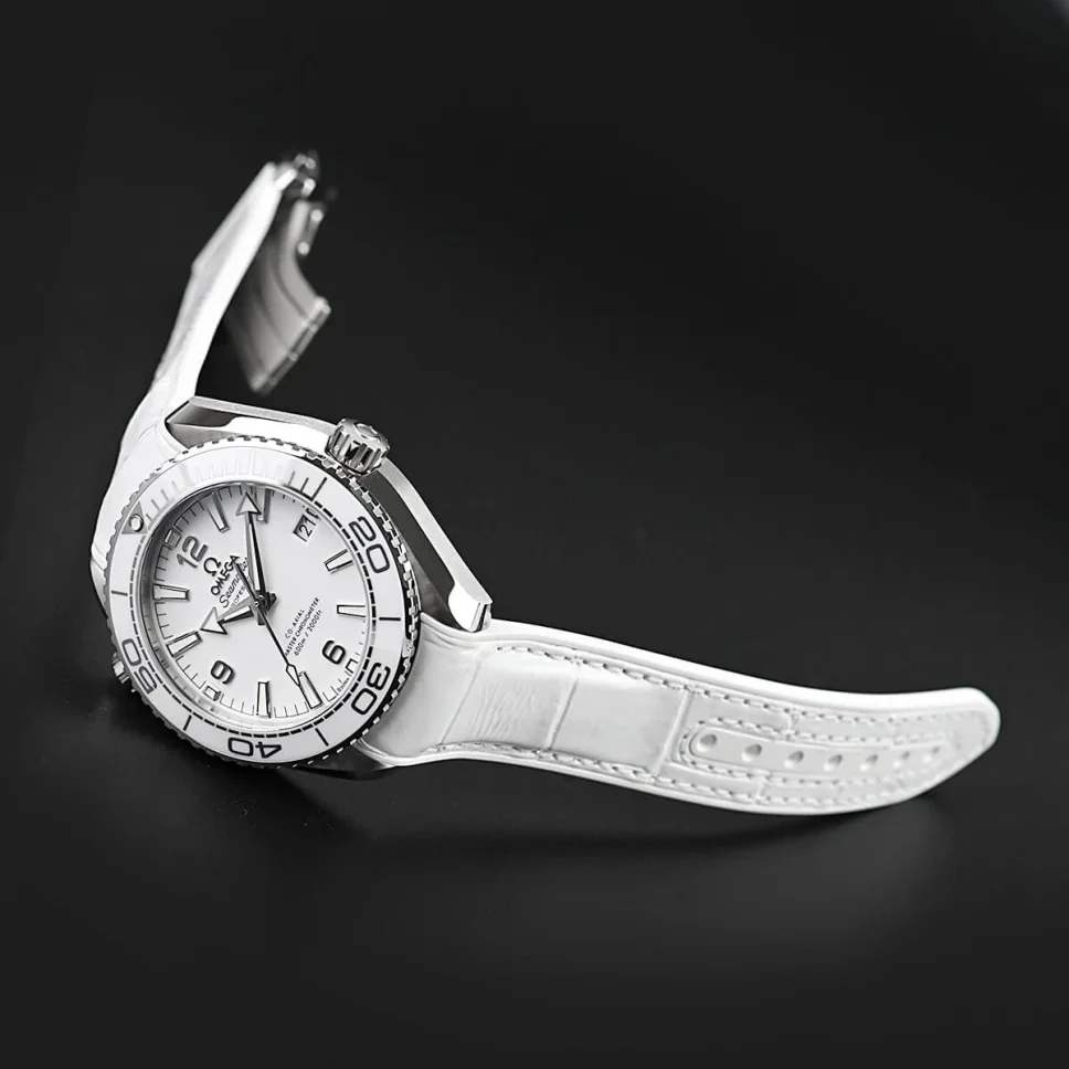 This model, with its scratch-resistant sapphire crystal, features a white ceramic dial with Arabic numerals and a date window at the 3 o’clock position. The white ceramic unidirectional bezel with OMEGA Liquidmetal™ diving scale is mounted on a 39.5 mm stainless steel case.