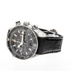 This model, with its scratch-resistant sapphire crystal, features a black ceramic dial with Arabic numerals and a date window at the 6 o’clock position. The dial presents a small seconds sub-dial, as well as 60-minute and 12-hour counters on one dial for intuitive reading of elapsed time. The black ceramic unidirectional rotating divers’ bezel, with its Liquidmetal™ diving scale, is mounted on a 45.5 mm stainless steel case.