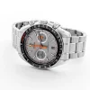 The bold matte black dial features two subdials, a date window at 6 o’clock, varnished white and orange hands, 18K white gold arrowhead indices with white Super-LumiNova, and a distinctive sporty-style minute hand. A black ceramic bezel ring with a tachymeter scale and Liquidmetal™ numerals frames the dial.