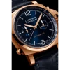 Blue sun-brushed with luminous arabic numerals and hour markers. Hollowed chronograph minutes counter at 3 o’clock and small seconds counter at 9 o’clock. Central chronograph seconds hands. Tachymeter scale in the external “rehaut”
