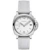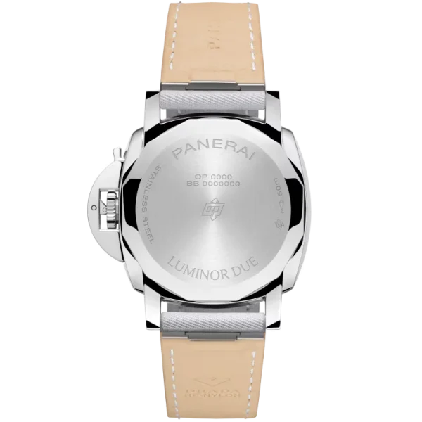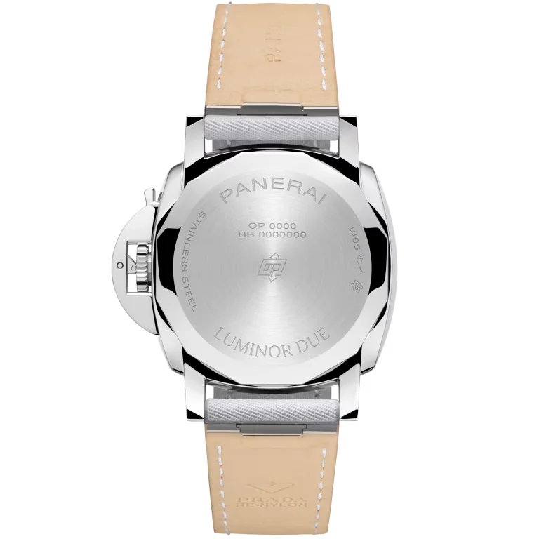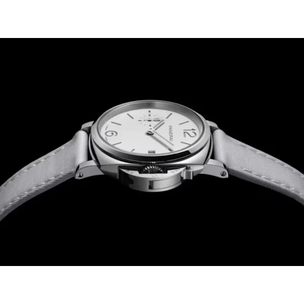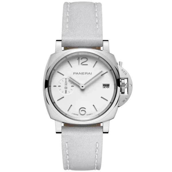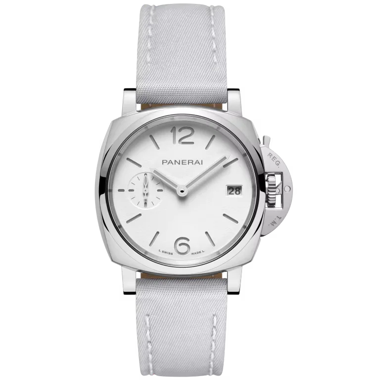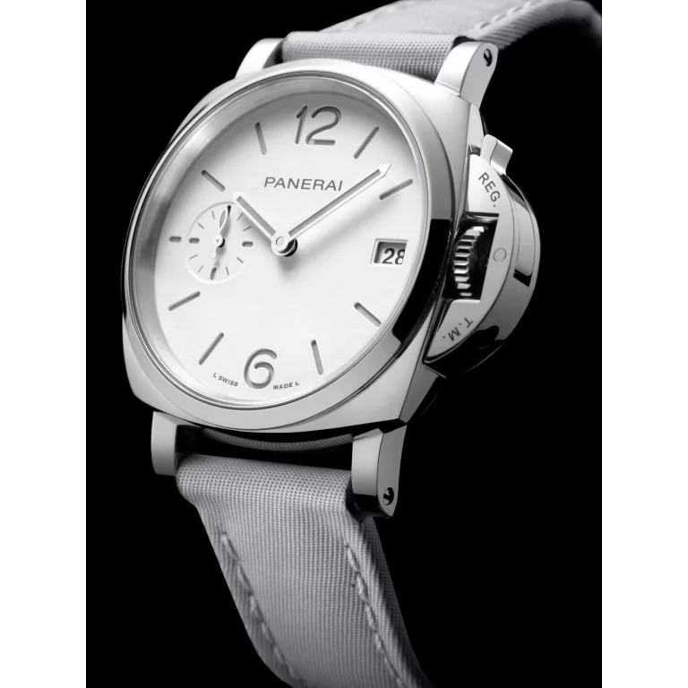 White with luminous Arabic numerals and hour markers. Date at 3 o’clock and small seconds at 9 o’clock.