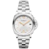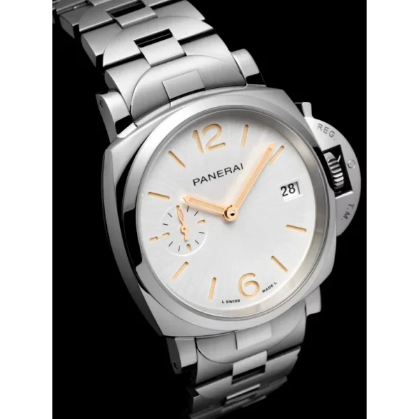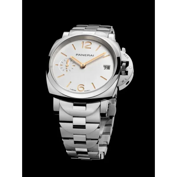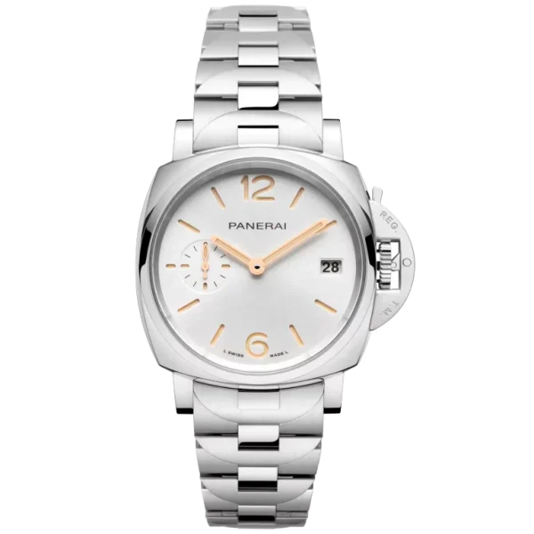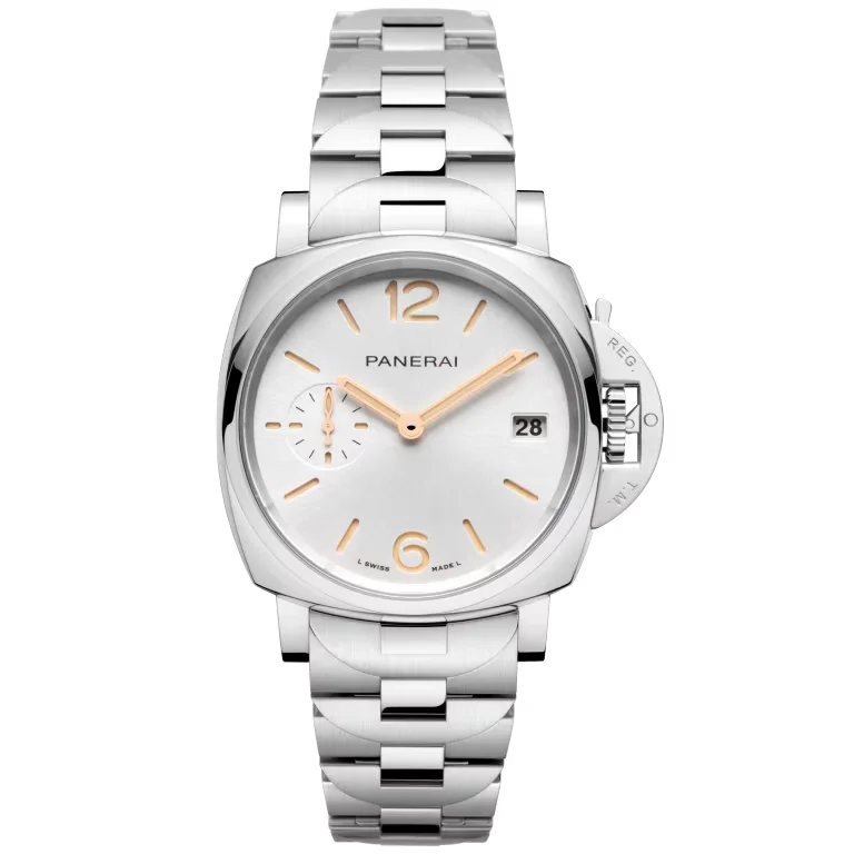 White sun-brushed with luminous Arabic numerals and hour markers. Date at 3 o’clock and small seconds at 9 o’clock