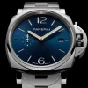 Blue sun-brushed with luminous Arabic numerals and hour markers. Date at 3 o’clock and small seconds at 9 o’clock.