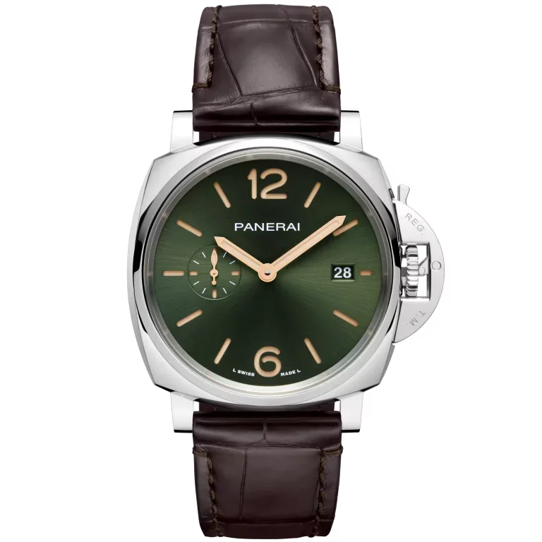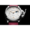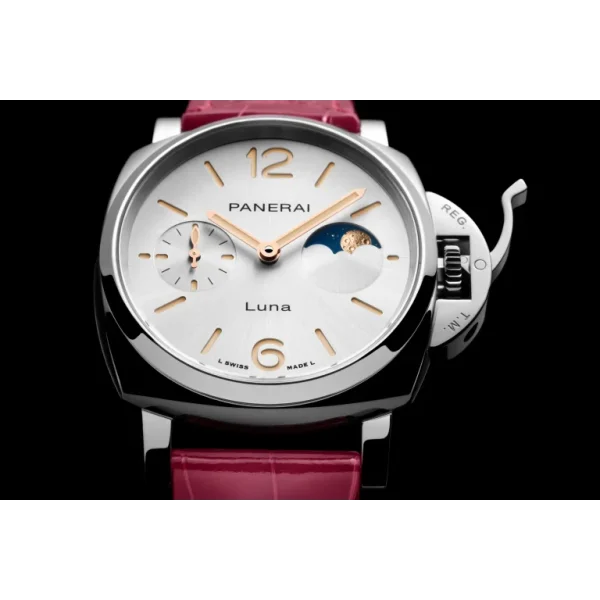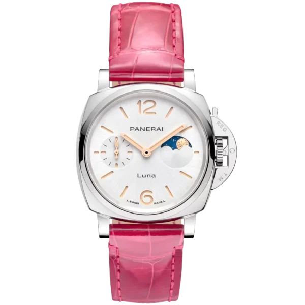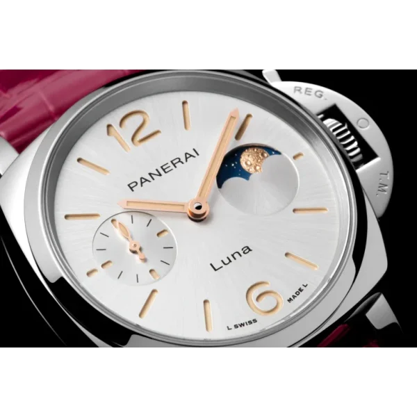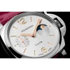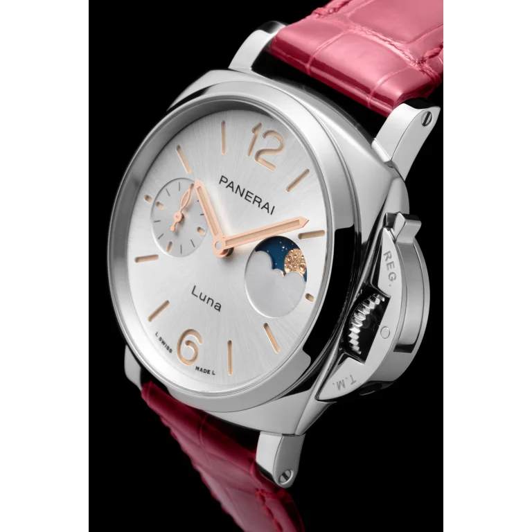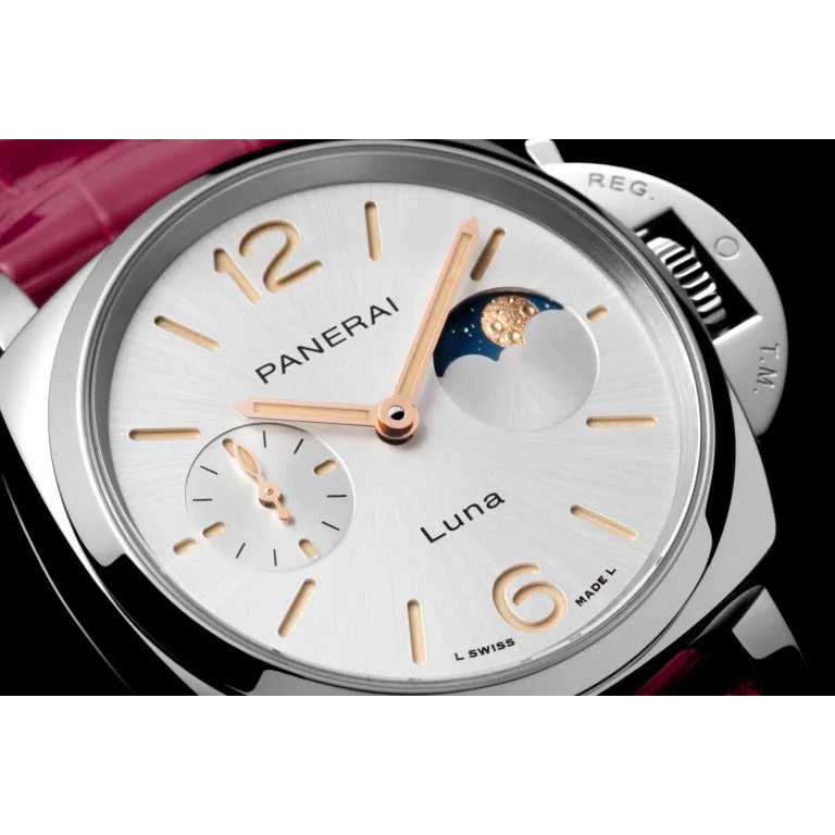 White sun-brushed with luminous Arabic numerals and hour markers. Moonphases at 3 o’clock and small seconds at 9 o’clock.