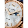 Mother of pearl with luminous Arabic numerals and hour markers. Date at 3 o’clock and small seconds at 9 o’clock.