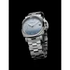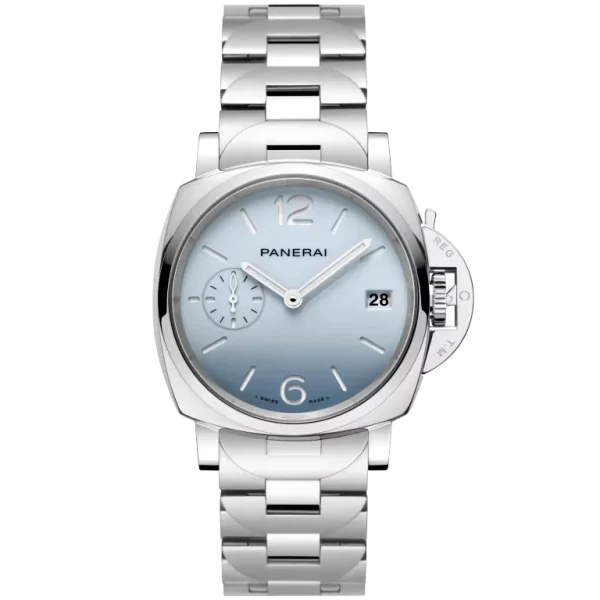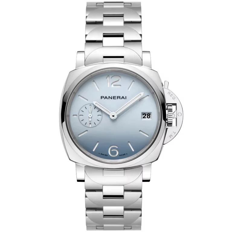 Light blue gradient with luminous Arabic numerals and hour markers. Date at 3 o’clock and small seconds at 9 o’clock.