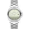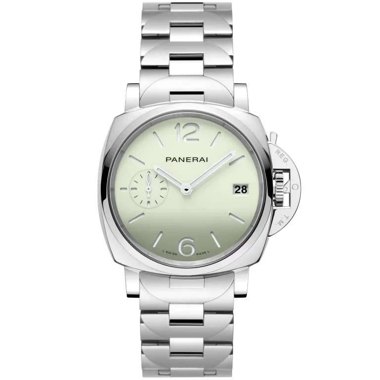 Light green gradient with luminous Arabic numerals and hour markers. Date at 3 o’clock and small seconds at 9 o’clock.