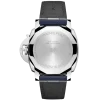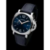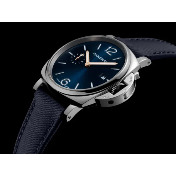 Blue sun-brushed with luminous Arabic numerals and hour markers. Date at 3 o’clock and small seconds at 9 o’clock