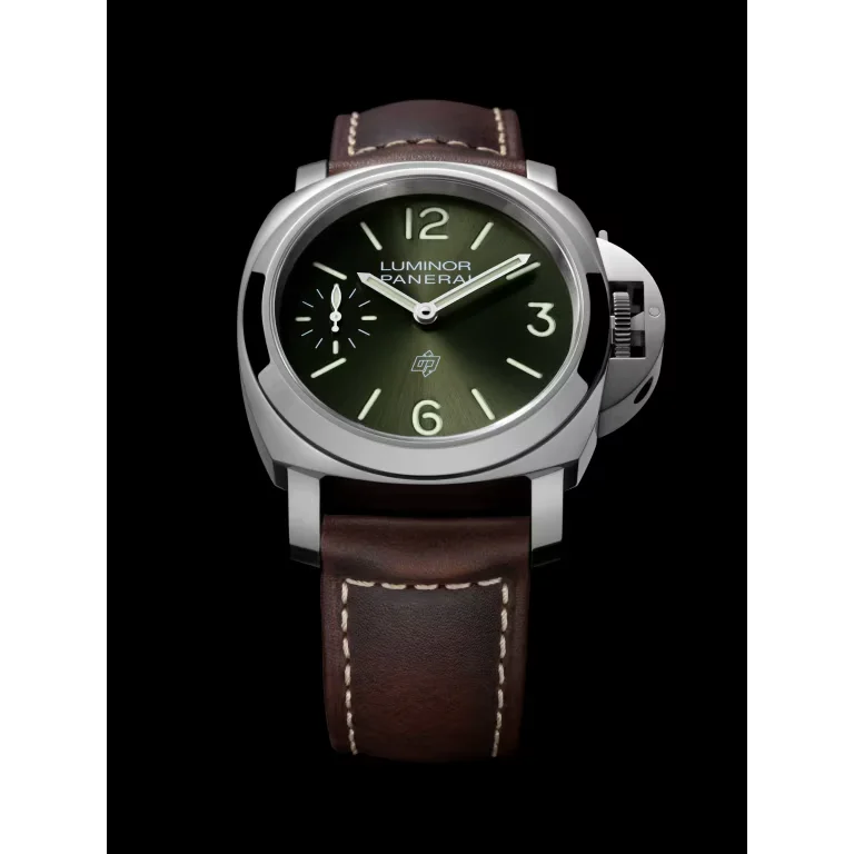 Green sun-brushed with luminous Arabic numerals and hour markers. Small seconds at 9 o’clock.