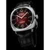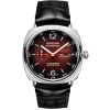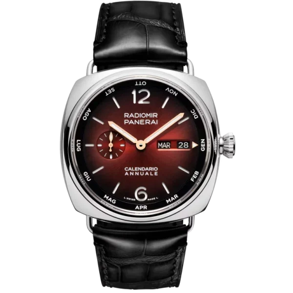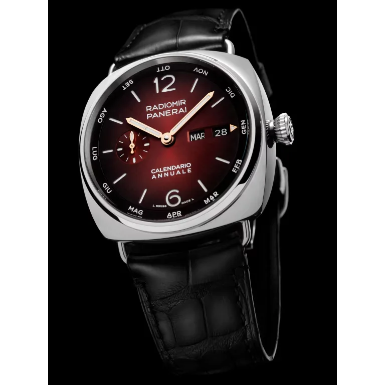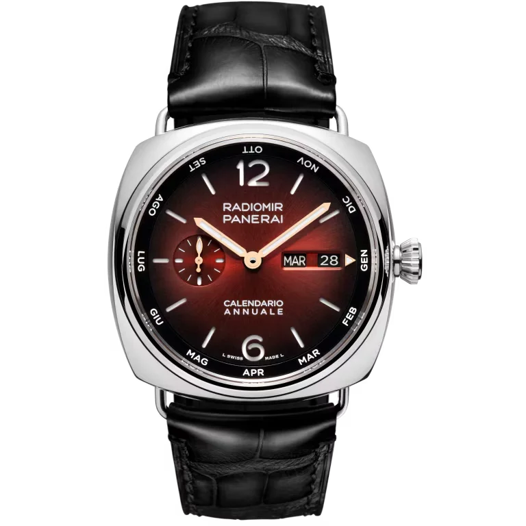 Burgundy sun-brushed with luminous Arabic numerals and hour markers. Month, Day of the week, date at 3 o’clock and small seconds at 9 o’clock