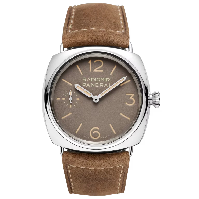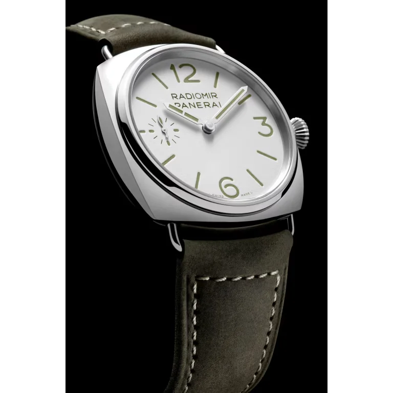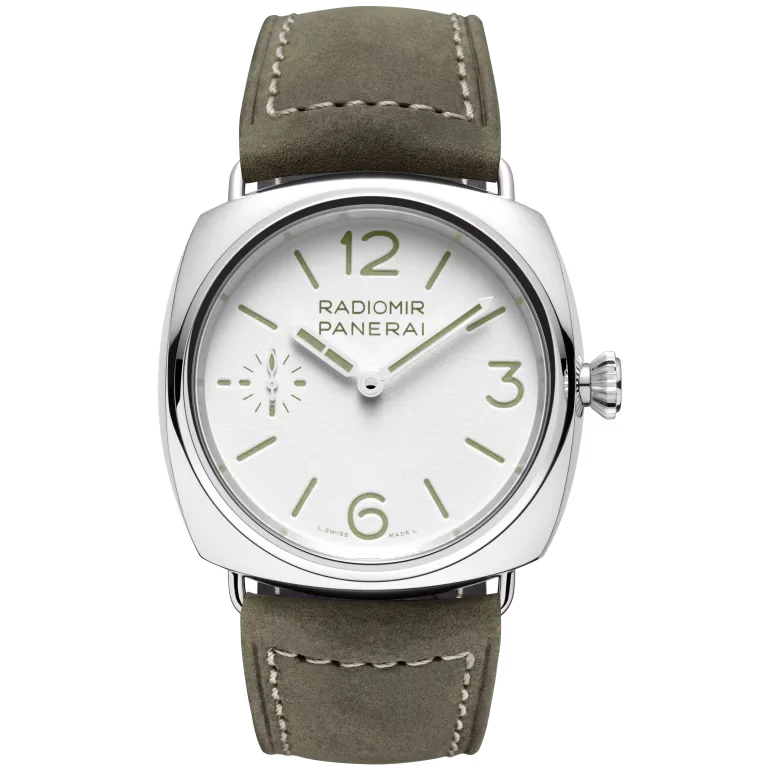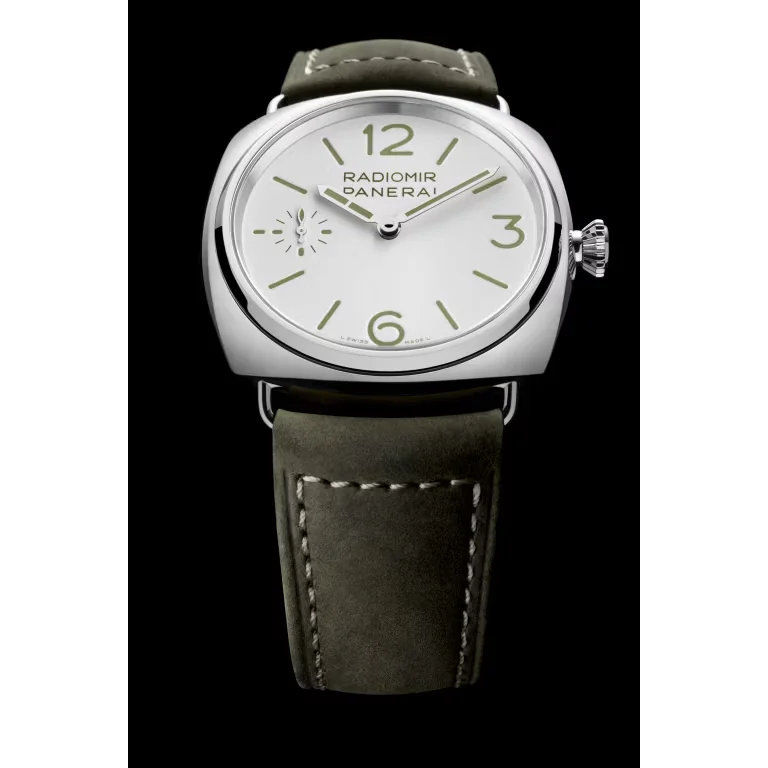 White grainy with luminous Arabic numerals and hour markers. with luminous Arabic numerals and hour markers. Small seconds at 9 o’clock.