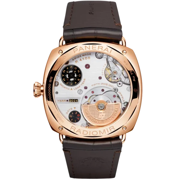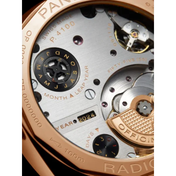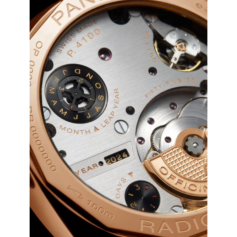 Automatic mechanical, Panerai P.4100 calibre, 15 1/2 lignes (35.1 mm), 7.0 mm thick, 55 jewels , Glucydur® balance, 28,800 alternations/hour (equivalent to 4 Hz). KIF® anti-shock device. Power reserve 3 days, two barrels, seconds reset, stop balance wheel