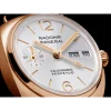 White sun-brushed with luminous Arabic numerals and hour markers. Day of the week, Date at 3 o’clock, seconds and 24h indicator at 9 o’clock