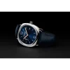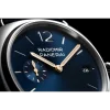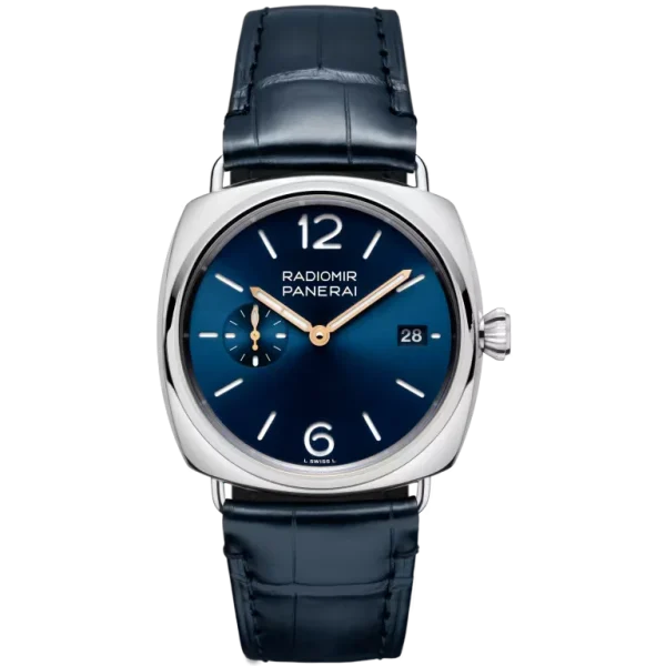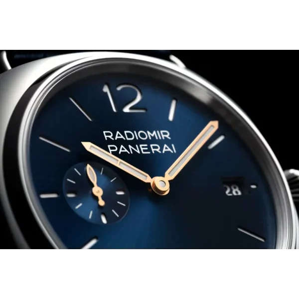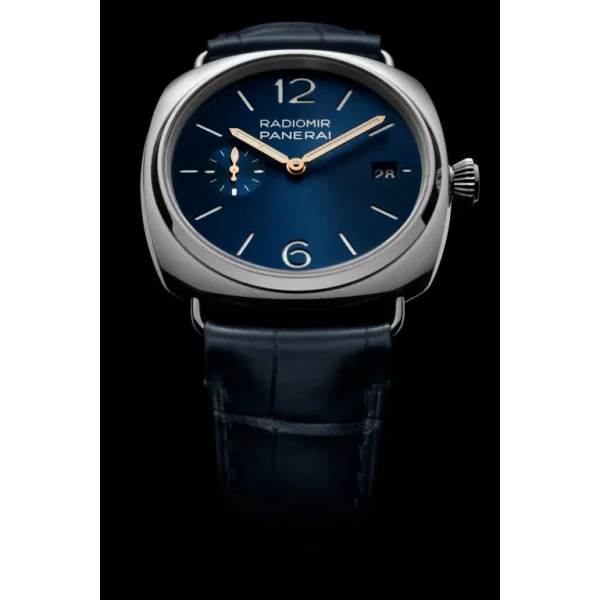Blue sun-brushed with luminous Arabic numerals and hour markers. Date at 3 o’clock and small seconds at 9 o’clock