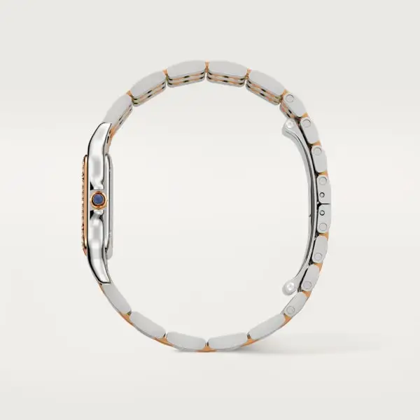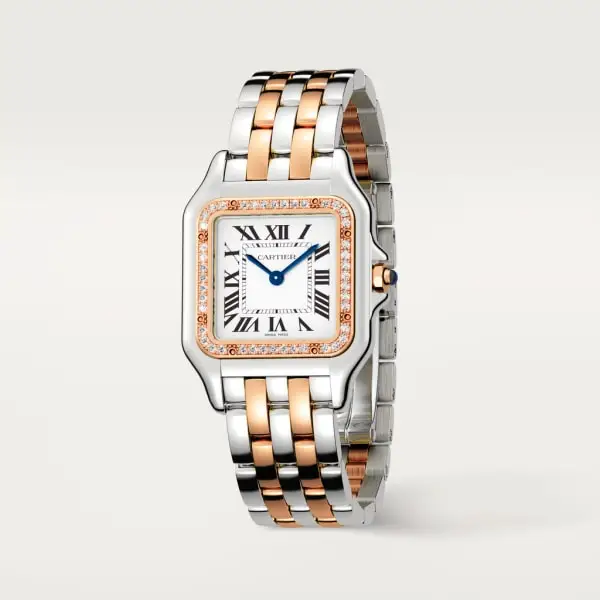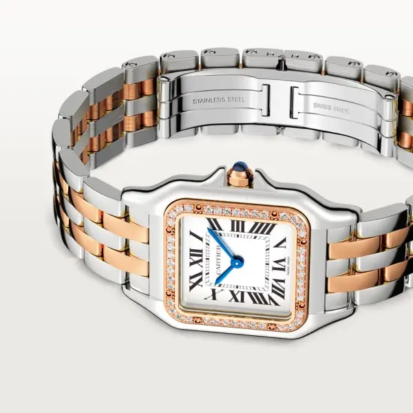 CROWNPull / PushBEZELRose Gold/DiamondCASE DETAILCase in 18K rose gold and steel, bezel set with brilliant-cut diamonds, dimensions: 22 mm x 30 mm, thickness: 6 mm, crown set with a synthetic blue spinel,MOVEMENTQuartzCASE BACKSolidMATERIALStainless SteelCASE SIZESmallCASE SHAPESquare