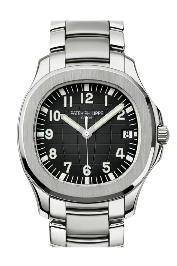 Silver-tone stainless steel case with a silver-tone stainless steel bracelet. Fixed silver-tone stainless steel bezel. Black dial with luminous hands and Arabic hour markers. Minute markers around the outer rim. Dial Type: Analog. Luminescent hands and markers. Date display at the 3 o’clock position. Patek Philippe Calibre 324 S C Automatic movement, containing 29 Jewels, composed of 213 parts, bitting at 28800 vph, and has a power reserve of approximately 45 hours. Scratch resistant sapphire crystal. Screw down crown. Transparent see through case back. Oval case shape, case size: 40 mm x 40 mm. Fold over with push button release clasp. Water resistant at 120 meters / 400 feet. Functions: date, hour, minute, second. Aquanaut Series. Luxury watch style. Patek Philippe Aquanaut Black Dial Stainless Steel Automatic Mens Watch 5167-1A Patek Philippe Stainless Steel Aquanaut Watch 5167/1A  5167-1A 5167