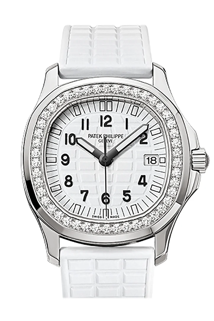 Stainless steel case with a tropical composite strap bracelet. 46 diamonds (~1 ct) bezel. Glitter white embossed dial with black hands and Arabic numeral hour markers. Minute markers around the outer rim. Dial Type: Analog. Date display at the 4 o’clock position. Patek Philippe Calibre E23-250 S C quartz movement. Scratch resistant sapphire crystal. Screw down crown. Case size: 35.6 mm. Oval case shape. Aquanaut fold-over clasp. Water resistant at 120 meters / 400 feet. Functions: date, hour, minute, second. Luxury watch style. Watch label: Swiss Made. Patek Philippe Aquanaut Diamond Ladies Watch
