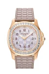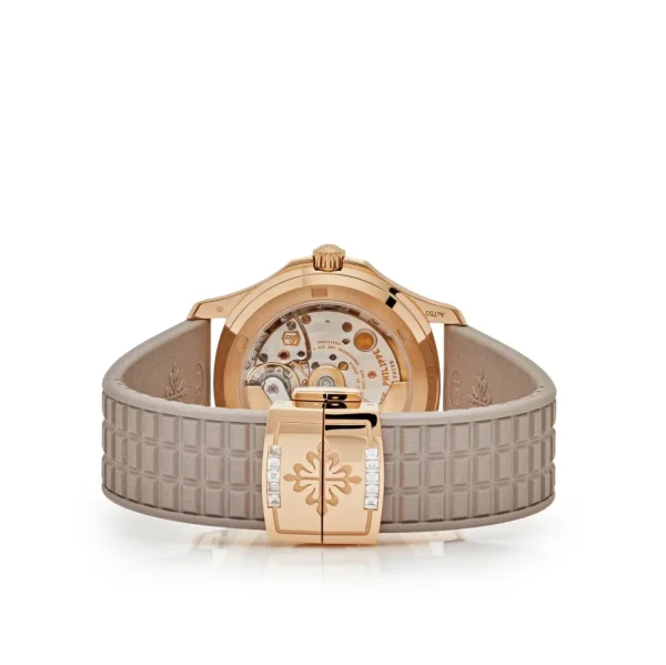 18kt rose gold case with a pearly beige rubber strap. Fixed bezel with diamond set. Mother of pearl dial with Arabic numeral & diamond hour markers. Dial Type: Analog. Date display at the 3 o’clock position. Patek Philippe Calibre 324 Automatic movement, containing 29 Jewels, composed of 182 parts, bitting at 28800 vph, and has a power reserve of approximately 45 hours. Scratch resistant sapphire crystal. Screw down crown. Transparent see through case back. Round case shape, case size: 35.6 mm, case thickness: 8.5 mm. Deployment clasp. Water resistant at 120 meters / 394 feet. Functions: date, hour, minute, second. Aquanaut Luce Haute Joaillerie Series. Luxury watch style. Watch label: Swiss Made. Patek Philippe Aquanaut Luce Haute Joaillerie Automatic Diamond Ladies Watch 5072R-001