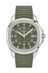 Patek Philippe reinterprets the quartz Aquanaut Luce in stainless steel with a larger diameter (38.8 mm) and a new integrated composite strap. This epitome of contemporary casual chic is attired in a bold khaki-green color adorning the dial and matching strap. Water-resistant to 120m, the rounded octagonal case is enhanced by polished and satin finishes. The bezel is lit up by a row of 48 diamonds (~1.11 ct). The patented folding clasp is secured by four independent catches. Quartz movement. Caliber E 23?250 S C. Date in an aperture. Sweep seconds. Khaki green, embossed with Aquanaut pattern, gold applied numerals. Steel. Screw-down crown. Solid case back. Water-resistant to 120m. Diameter (10–4 o’clock): 38.8 mm. Height: 7.9 mm. 48 diamonds: ~1.11 ct. (bezel). Composite material, khaki green. Aquanaut fold-over clasp.