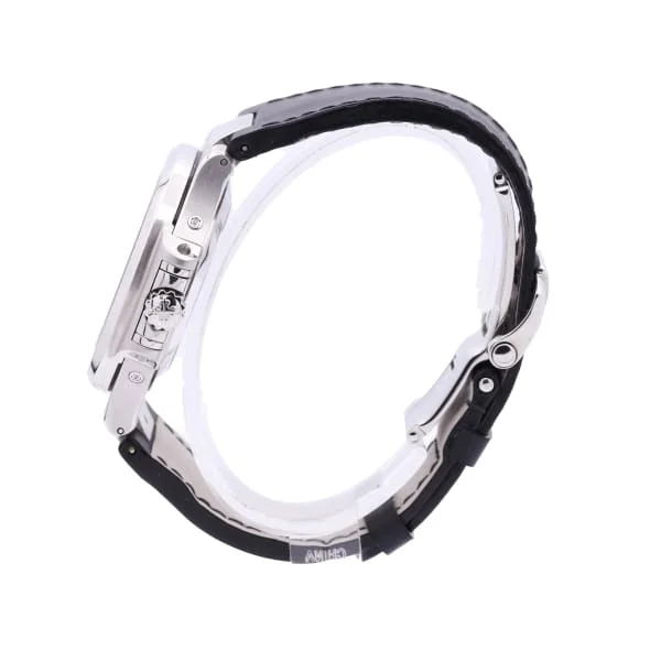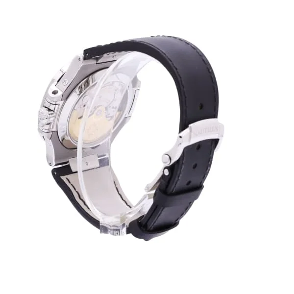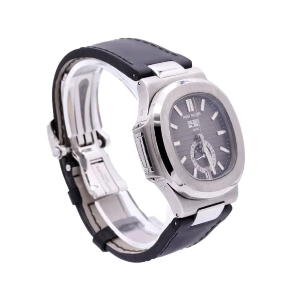 Patek Philippe Nautilus Annual Calendar, 40.5mm, Stainless Steel Watch. Black Dial with luminous hands and stick hour markers with luminescent fill. Minute markers around the outer rim. Annual calendar complication with day, date, and month is shown in apertures. Date display at the 6 o’clock position. Day of the week and month at the 12 o’clock position. 24-hour and moon phase sub-dial at the 6 o’clock position subdials. The watch dial is protected by a Scratch-resistant sapphire crystal. They have a screw-down crown and transparent sapphire crystal case back. The shape of the watchcase is a Cushion. Fixed silver-tone Stainless Steel bezel. This model has the following features: annual calendar, moon phase, month, date, day, GMT, second-time zone, hour, minute, second. The movement is mechanical self-winding Patek Philippe Caliber 324 S QA LU 24H/303 containing 34 Jewels and has a power reserve of approximately 45 hours. The watch presented on a black crocodile/alligator leather strap with Fold over with a safety release clasp. The water resistance is up to 120m/400ft.