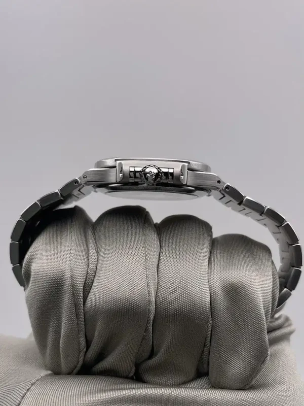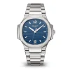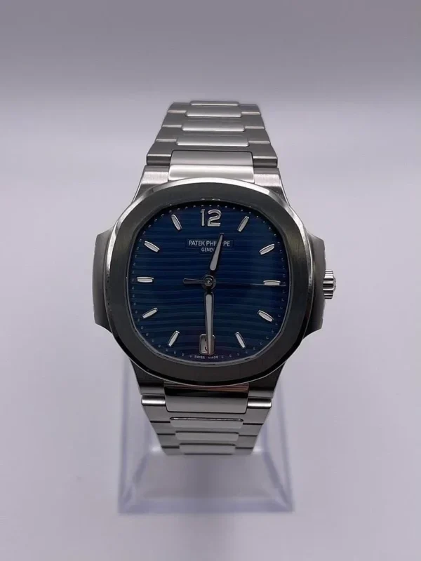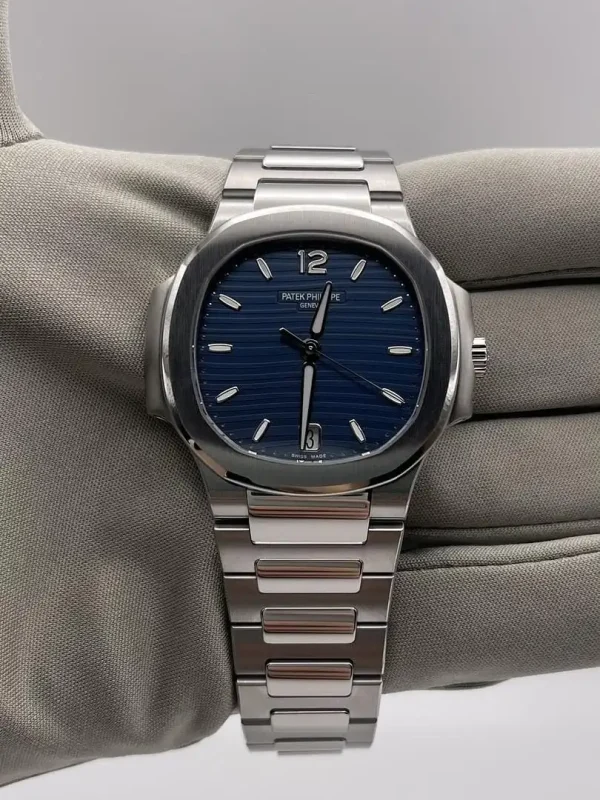 The centerpiece of this reference is the rich blue opaline dial, enhanced by the horizontal wave pattern exclusive to the ladies’ Nautilus collection. The color transitions beautifully under different lighting, adding depth and character. Applied white gold Arabic numerals and luminescent baton-style hands ensure excellent readability, while a date window at 6 o’clock provides daily utility without disrupting the dial’s symmetry.