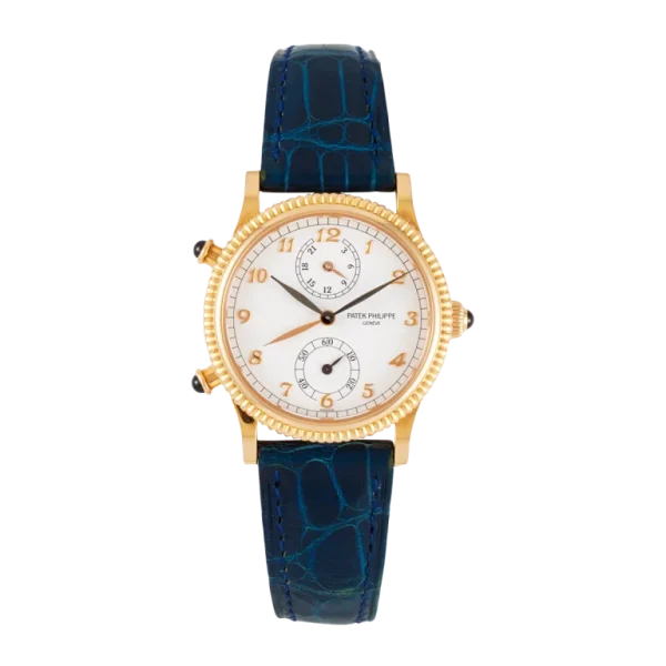 Also this Patek Philippe Lady’s Travel Time Ref#:4864R has a function subsidiary dials for 24 hours and seconds, buttons and crown set with sapphire cabochons, water resistant to 25m., leather strap. So in just a one click of a Button and it is yours.