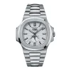 Patek Philippe Watches Nautilus Mens Stainless Steel 5726/1A-010. 40.5mm (at 10-4 o’clock) stainless steel case, sapphire crystal back, silvery white dial with gold applied hour markers with luminescent coating, self-winding Caliber 324 S QA LU 24H movement with annual calendar, day, date, month in apertures, moon phases and 24-hour dial, sweep seconds hand, approximately 35-45 hours of power reserve, stainless steel bracelet Nautilus fold-over clasp. Water resistant to 120 meters.