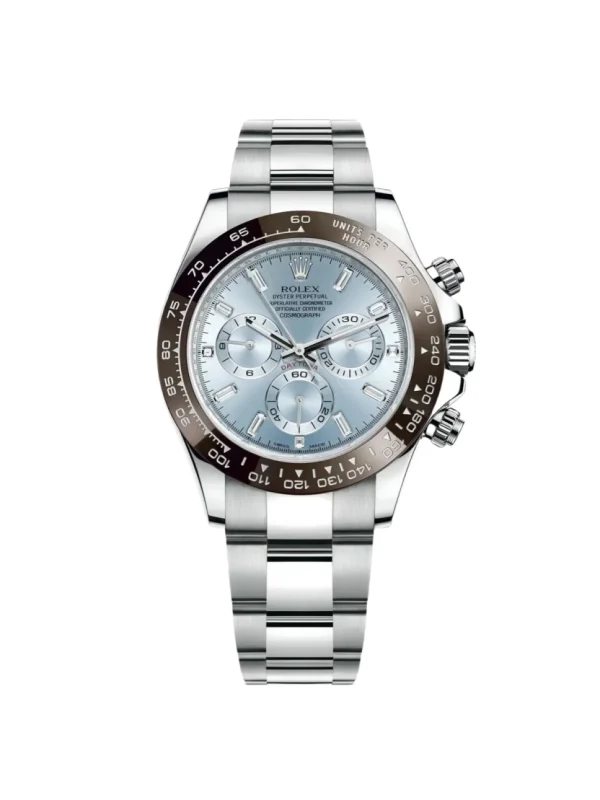 BEZEL | – Fixed (does not move). Chestnut brown Monobloc Cerachrom bezel in ceramic with Platinized engraved tachymetric scale |