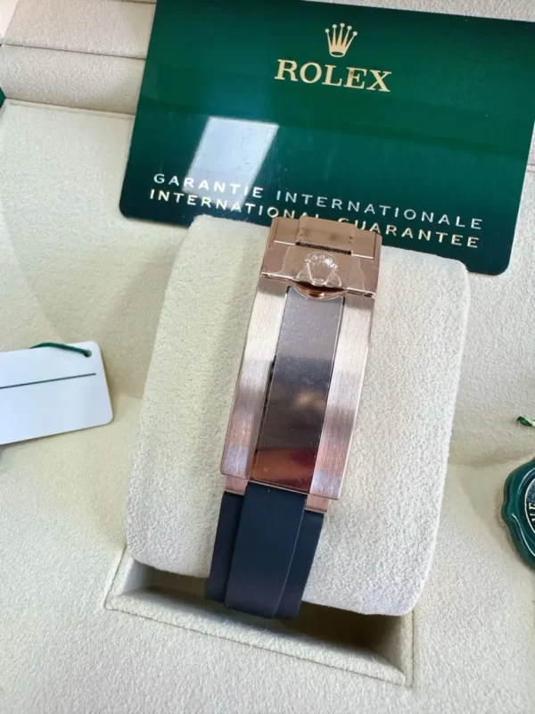 Indulge in the pinnacle of elegance and precision with the Rolex Cosmograph Daytona 126515LN-0004. This luxurious watch boasts a 40mm 18k Everose gold case and a sleek black Cerachrom ceramic bezel with a tachymeter scale. The automatic chronograph is certified as a chronometer, ensuring precision timekeeping. The contrast between the bright black and sundust dial, featuring diamond hour markers, creates a timeless aesthetic. Complete with an Oysterflex bracelet and Oysterlock safety clasp with Glidelock extension, this Rolex watch effortlessly combines style and functionality. Enhance your watch collection with the Rolex Cosmograph Daytona 126515LN-0004.