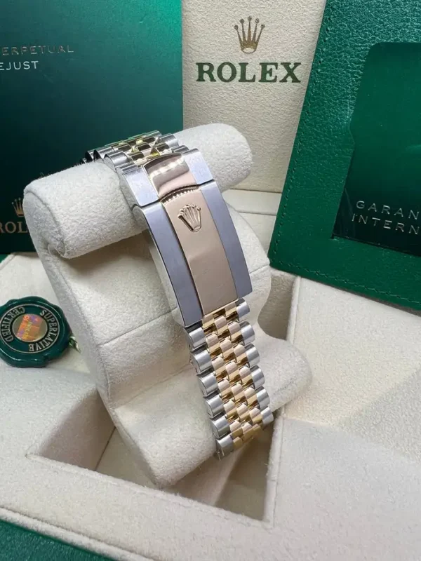 BRACELET | – Two Tone Jubilee Bracelet, – Made with Solid 904L Grade Stainless Steel with DLC scratch-protection coating and 18k Gold plating on the middle links – Solid threaded screws, so you can easily remove bracelet links with just a small screwdriver – Folding Oysterclasp with Easylink 5 mm comfort extension link, exactly as Original |
