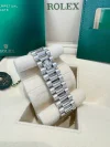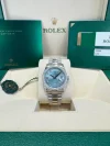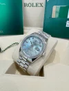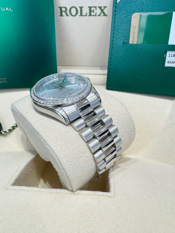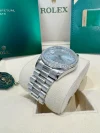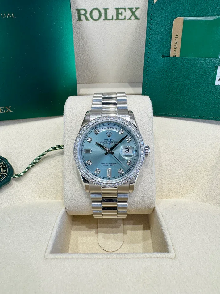 Dial: Ice blue dial with baguette and round diamond hour markers. Date calendar at 3 o’clock aperture and weekday in Spanish at 12 o’clock. Dial is authentic Rolex, not original to watch