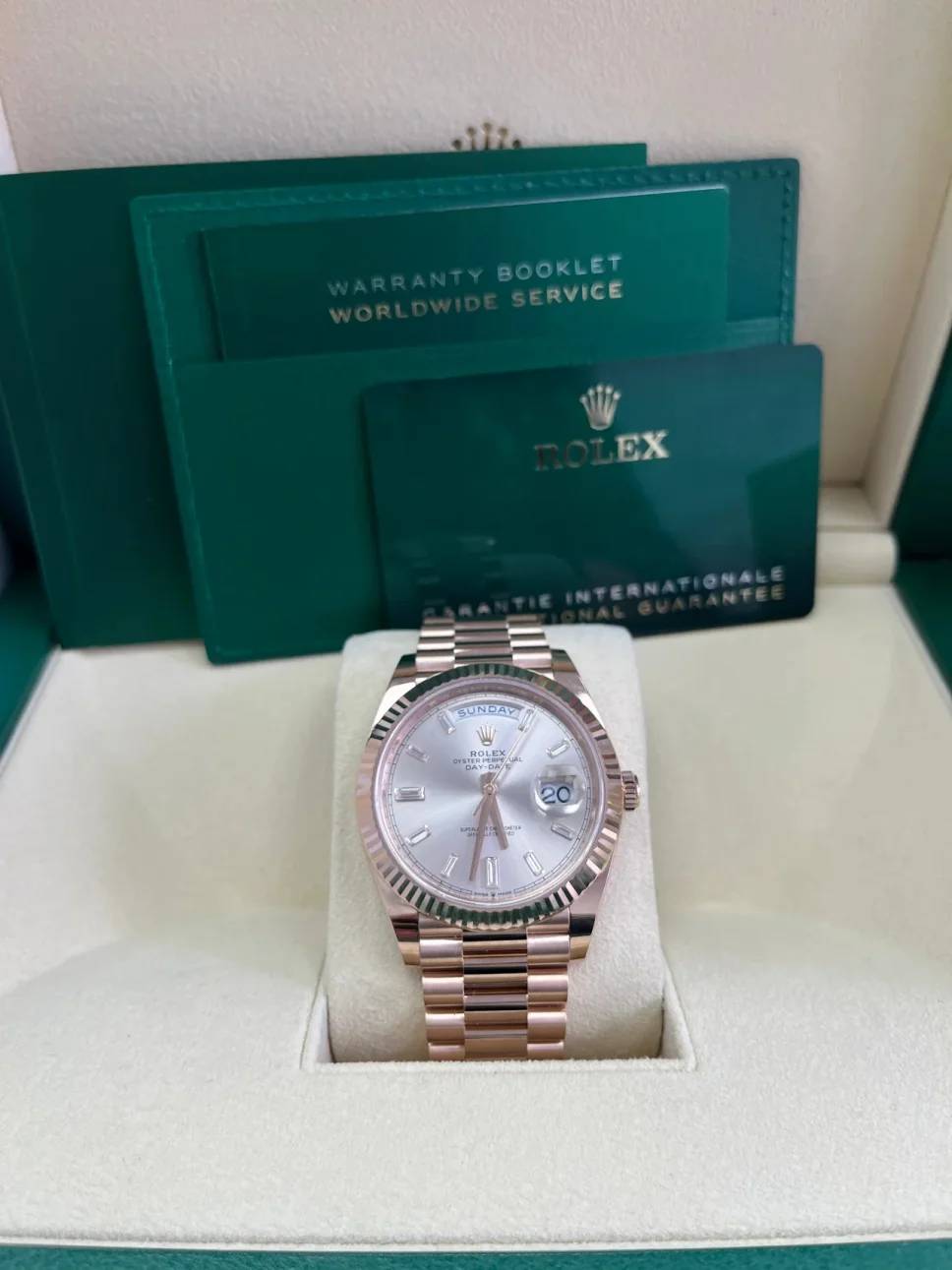 Rolex Day-Date “President” 40mm Everose Gold Sundust Diamond Baguette Dial – 228235