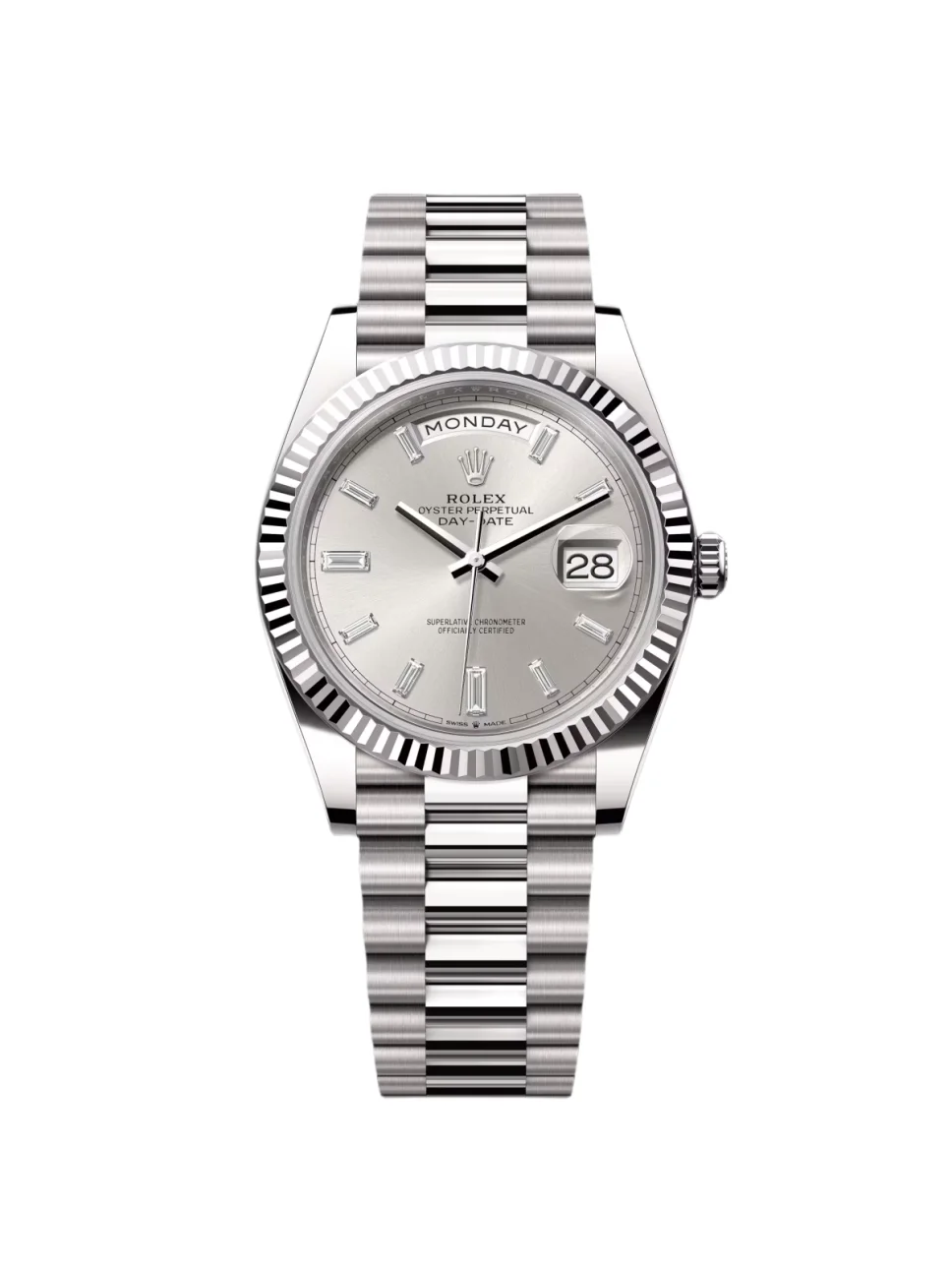 Rolex Day-Date “President” 40mm White Gold Silver Diamond Baguette Dial – 228239