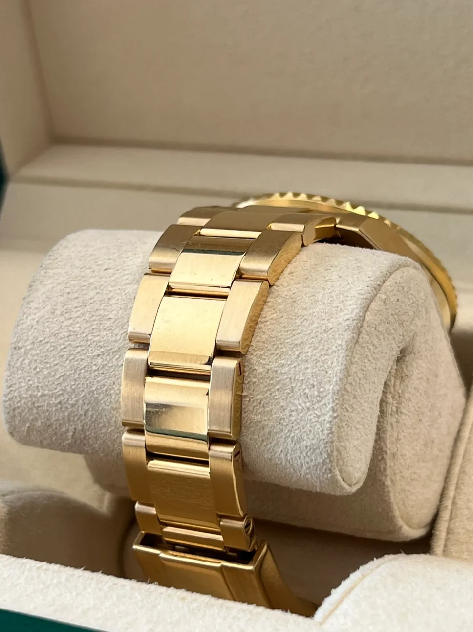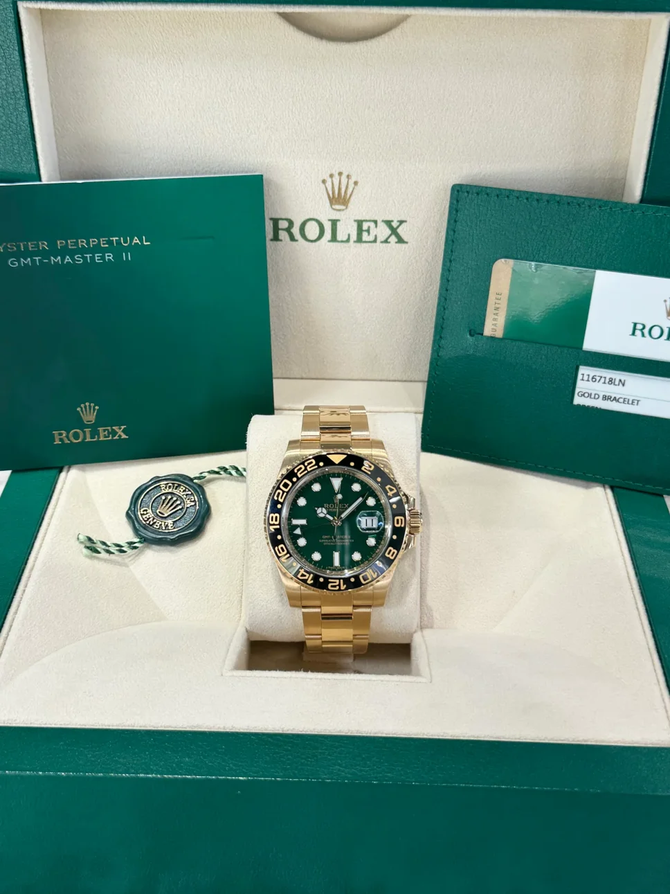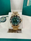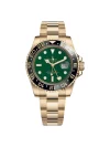 The beautiful Rolex 116718GSO watch features a 18kt yellow gold 40mm case, with a bi-directional rotating 18kt yellow gold bezel, and a green dial covered by a scratch resistant sapphire crystal. The stylish wristwatch is equipped with an exclusive 18kt yellow gold rolex oyster which combines comfort and sturdiness. This horological trendy device has GMT, second time zone, date, hour, minute, second, chronometer functions.