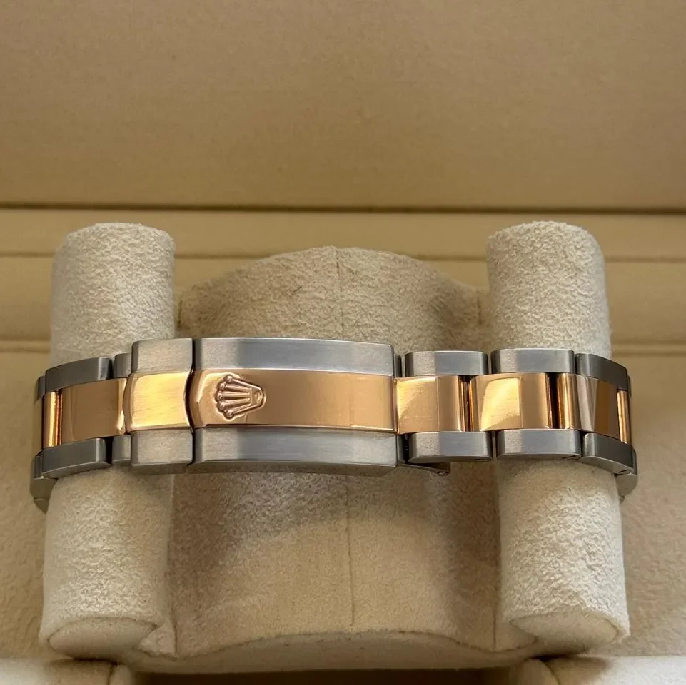 | Bracelet: | Stainless steel and 18k everose gold oyster bracelet with a fold over clasp. Fits 7″ wrist |