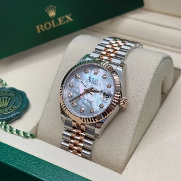 Be the first to review “Rolex Lady-Datejust 28mm 279171 White Mother Of Pearl Diamond Oyster Stainless Steel and Rose Gold”
